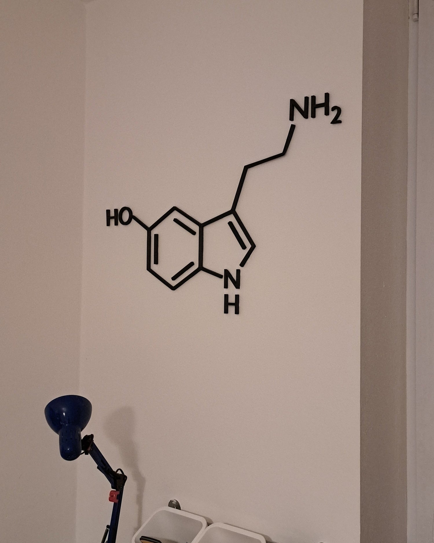 A stylish and geeky 3D-printed serotonin molecule for science lovers, perfect for wall decor or a unique gift! I'll transform a picture of this molecule into a 3d printed piece of art.
